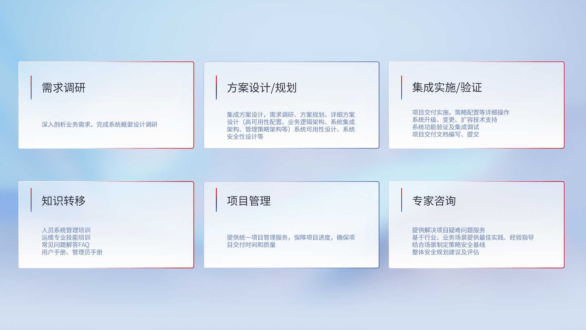针对客户行业特性,,将宏观的安全战略和需求,,,通过专业的交付服务,,,实现项目落地,,,为客户提供标准规范的集成交付服务。。
